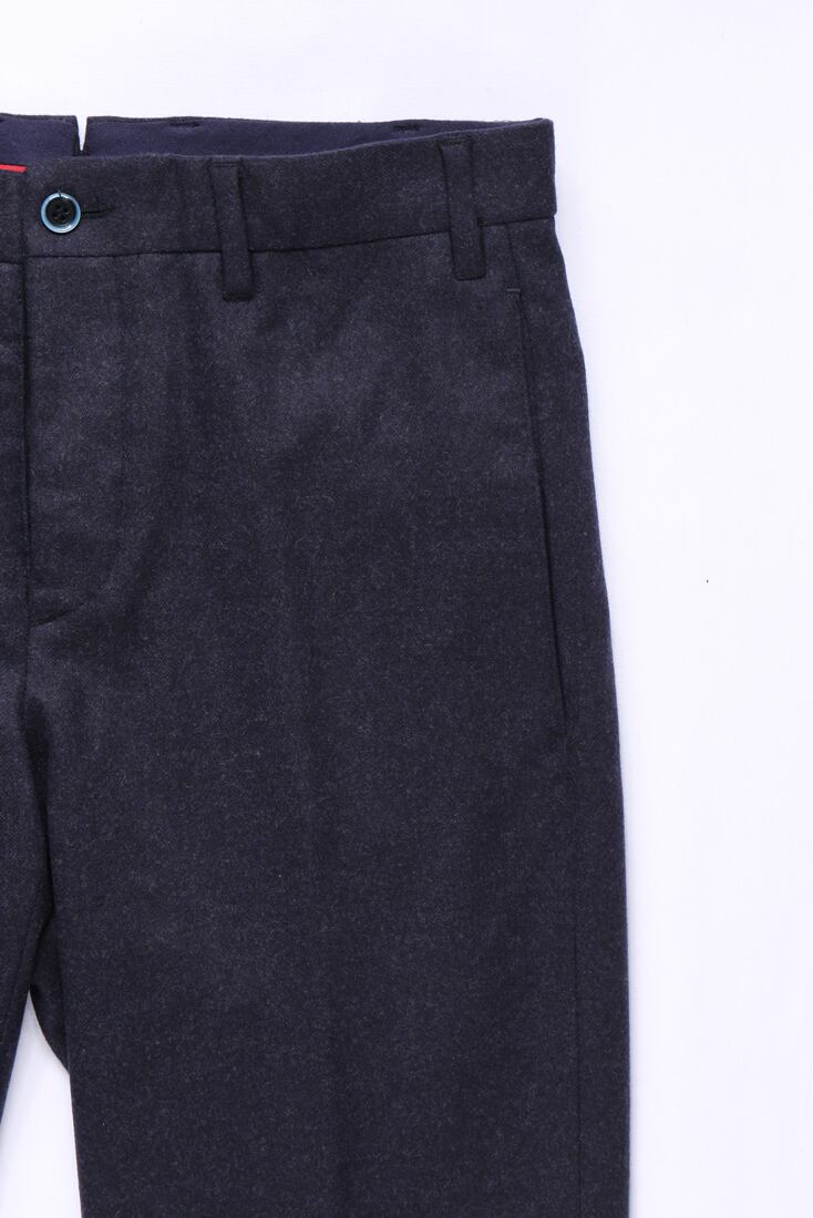 シルエットも綺麗なsanRemoのネイビーのパンツになります。素材に毛が細く柔らかい貴重なヴァージンウール100%使用していますので保湿や防水にも優れ最高の肌触りだと思います。