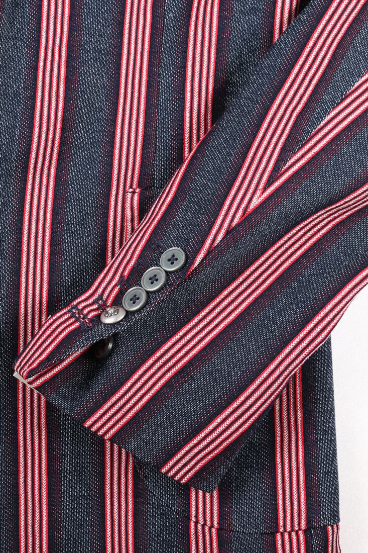 幾何学模様や大柄のドットが施された生地を使用し、袖ボタンの1つがメタルになっているなど、独創性のあるジャケットを得意としています。